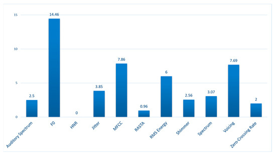 As far as acoustic features are concerned, we chose to employ a comprehensive set that included the vast majority of features considered useful in speech analysis, hence our choice to use the INTERSPEECH 2016 feature set. In accordance with the principle of the Curse of Dimensionality, the original number of features, intentionally large as to cover all possibilities, was then algorithmically reduced using a CFS [31]. Although MFCC are the most widely employed domain for SR, especially with the introduction of the concept of i-vectors, it is undoubtable that many other features can indeed define the peculiarities of a speaker’s voice. F0 and its variations are deeply related to intonation, whereas the amount of short breathing pauses, evaluated by means of the Voicing Probability, are shown to be able to classify between speakers [32]. The importance of said features is confirmed by the results of the feature selection, that shows the number of selected features being 3.45% of the original number. The distribution of the main domains of the selected features, computed as a percentage of their original number is reported in Figure 7. Each domain embeds many different linear (e.g., maximum), differential (e.g., delta coefficients), statistical (e.g., standard deviation) descriptors.