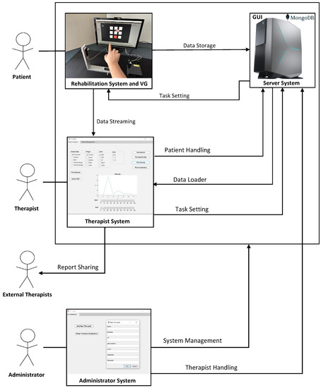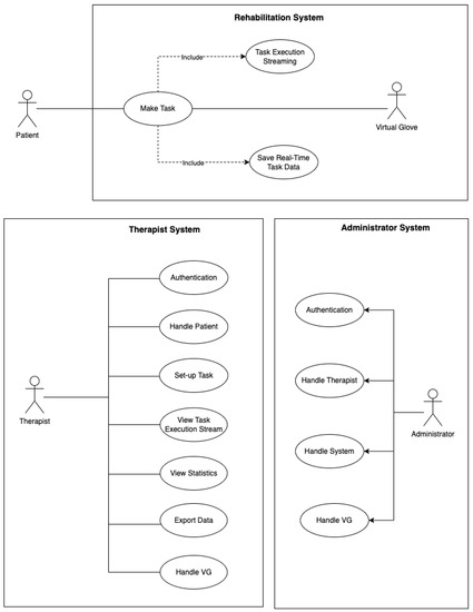 The actors involved in the proposed framework are four: the Patient, the VG, the Therapist, and the Administrator (see Figure 5). The most important of those is the Patient, a person with hand mobility problems whose role is to perform rehabilitation tasks, as part of the rehabilitation procedure, using Rehabilitation System (RS) combined with the VG. The Patient should only focus on carefully completing his assigned tasks to the best of his ability, without having to take care of anything else.