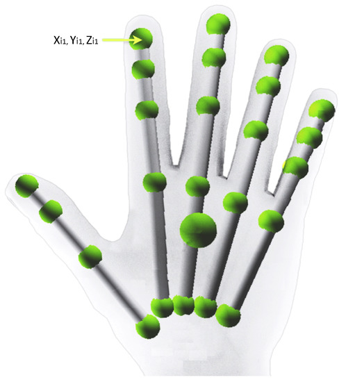 Skeletal hand model (skin contour is reproduced for reference) in which each joint is represented by a green sphere.