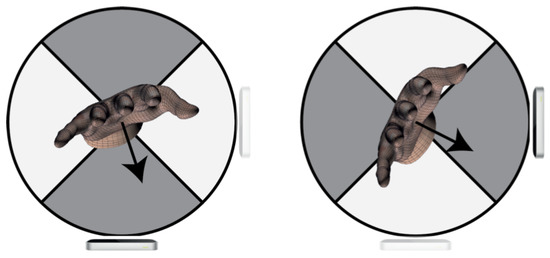 In the VG, data fusion is performed in two possible ways. The first one is a binary switch approach. Here the palm’s normal direction (a vector orthogonal to the palm) defines what sensor contributes to the final result. More specifically, palm’s normal direction is utilised to compute the angle between the X-axis of the horizontal LEAP reference system and the projection of p on the X-Y plane. If the angle is between 225 and 315 (palm facing down) or 45 and 135 (palm facing up), the horizontal LEAP is activated, but the vertical sensor data is ignored. Outside this range, the sensors’ functions are reversed: vertical LEAP data becomes active, while horizontal LEAP data is disregarded (Figure 4).
