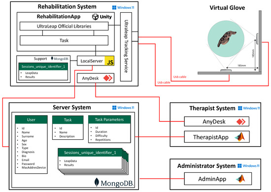 As we mentioned before, it is important that the Patient can perform rehabilitation exercises from home or in a laboratory together with the Therapist. To ensure the performance of the telerehabilitation, we deployed the Server System in a PC with Intel I7, 32 Gb Ram, NVIDIA GE Force GTX 1080 to manage the large size of the data coming from the RS and TS. For the Therapist System and the Administrator System, the choice of the PC is not crucial as the software does not require great performance specifics. The connection between the macro-components was done via the WAN network. The location of the server is indicated in the upper-right part of Figure 1. For data storage, MongoDB was chosen as a tool to design the database. Unlike SQL databases, MongoDB does not use a fixed scheme for its documents. Since the data from a LMC is a JSON object, MongoDB is the best choice for this project because no preprocessing is necessary before inserting the data into the database; the collecting system maintains the data structure to facilitate data sharing among therapists or with third-party software. MongoDB is one of the fastest databases regarding reading/writing operations. This also allows streaming the Patient’s Task in real-time to the Therapist or extending the number of LMC used for the VG, with a reduced effort.