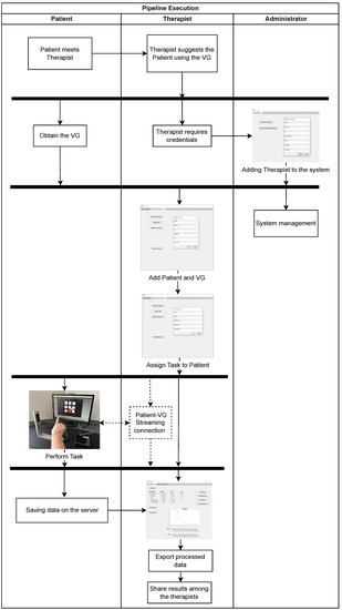 We imagine the execution of the pipeline inside a healthcare facility, and we describe it as reported in Figure 7. During a face-to-face meeting, the Therapist suggests the Patient uses the VG. Hence, the Patient is furnished with a VG, and at the same time, the Therapist requires the Administrator to have the credentials to assist in the rehabilitation through this framework. Once the Therapist has obtained the credentials, he is allowed to use the GUI. The Therapist uses these credentials for inserting the Patient into the system, associating him with the collected VG, and assigning him a task, through a GUI. The same credentials are used for accessing the database and performing data analysis. Making this procedure allows the VG to send all the data of the Task to the Server. Then, the Therapist teaches the Patient how to use the VG system with the assigned task. In Figure 8, the course of the data produced during a rehabilitation task is shown. The Patient turns on the VG, and the system loads the assigned task and executes it. Once the execution is completed, all data related to the task are moved to the central database in the Server System.