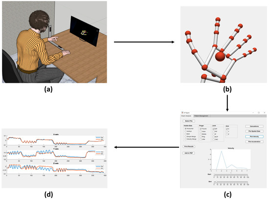 VG Data-flow pipeline. Here, one can see (a) the Patient performing a task, (b) the generated hand model, (c) the Therapist’s interface for data analysis and visualization, and (d) created plots presenting joint movement. The associated colors and the respective legend in (d) are irrelevant for the purpose of this paper: they just serve to show the general structure of the report.