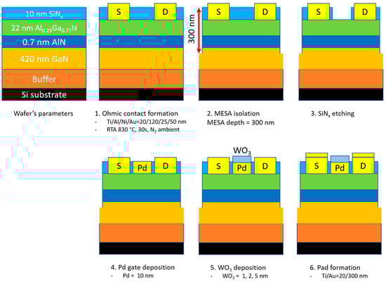 The gas sensors based on AlGaN/GaN HEMTs were fabricated by the conventional photolithography process at the Inter-University Semiconductor Research Center (ISRC), Seoul, Korea. The AlGaN/GaN-on-Si wafer was purchased as a commercial product, which consisted of a 10 nm in situ SiNx layer, a 22 nm Al0.23Ga0.77N barrier layer, a 0.7 nm AlN nucleation layer, 420 nm i-GaN layer, and buffer layers. First, the source and drain electrodes were patterned by the maskless patterning system, and then, a metal stack of Ti/Al/Ni/Au (20/120/25/50 nm) was deposited by e-beam evaporation. After the lift-off process, the samples were followed by rapid thermal annealing (RTA) at 830 °C for 30 s in N2 ambient. Next, the mesa isolation at a depth of 300 nm was patterned and applied by inductively coupled plasma (ICP) etching with a BCl3/Cl2 mixture to remove the active layers between devices. Then, the gate region was patterned and followed by SiNx etching by ICP etching with SF6 plasma. Afterward, a 10 nm Pd layer and a WO3 layer were formed by e-beam evaporation and a lift-off process on the gate region. In this work, we fabricated 3 samples with different WO3 thicknesses of 1, 2, and 5 nm (labeled S1, S2, and S3, respectively) to investigate the influence of the WO3 thickness on hydrogen gas selectivity. Finally, the interconnect bi-layer probing pads of Ti/Au with thicknesses 20/300 nm were formed by e-beam evaporation and lift-off. The dimensions of the gate electrode were 36 µm × 120 µm, the source-gate, and gate-drain spacings were 2 µm. The as-fabricated devices were exposed at 400 °C for 10 min in air for stabilization. The cross-section of the fabrication process is shown in Figure 1.