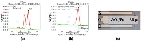 As reported in [47,48], the pure WO3 thin film exhibited no reduction reaction to H2 at 50–300 °C. Hence, the thin film of WO3 acted as a gas filter without compromising Pd’s hydrogen sensing and played an essential role in archiving high selectivity for H2 sensing.