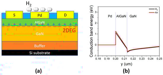The gas sensors based on Pd-AlGaN/GaN were widely investigated and reported [17,18]. When hydrogen molecules came into contact with the Pd catalyst layer, the Pd layer enabled the hydrogen dissociation into hydrogen ions (H+) on the Pd surface. Due to their tiny size, the positively charged hydrogen ions easily diffused through the gate layer via pores and reach the surface of the AlGaN layer. The presence of the positive ions increased the two-dimensional electron gas (2DEG) concentration and lead to an increase in drain current (Figure 3a). The change of conduction band energy with hydrogen exposure was shown in Figure 3b.