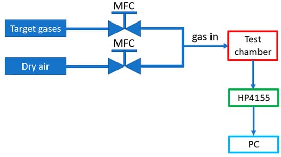 The gas sensor measurement setup was shown in Figure 4. Gas sources consisted of the target gases (H2, NO2, CH4, CO2, NH3, and H2S) and synthesized dry air (O2/N2 mixture) as the reference gas. The gas flow was mixed using mass flow controllers (MFCs). The sensors were loaded in a test chamber with a hot chuck to control the operating temperature. Output and gas sensing characteristics were measured by HP 4155A parameter analyzer. The gas flow rate was maintained at 200 sccm in all measurements.