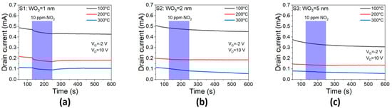 Figure 5 showed the drain current response to 10 ppm NO2 at 100, 200, and 300 °C. Our previous work [49] reported that high relative sensitivity towards NO2 could be achieved in Pd-AlGaN/GaN HEMT sensor by optimizing AlGaN barrier thickness along with gate bias modulation effect. The sensitivity to 10 ppm of NO2 at 300 °C was 6% at VG = 0 V and 45.4% at VG = −1 V, which was much improved in the sensor device with 13 nm AlGaN barrier. However, a thin layer of WO3 deposited on top of the Pd layer made the sensors remarkably less sensitive to NO2 as shown in Figure 5. When Pd gate was covered with 1 nm of WO3, the S1 sensor still demonstrated the sensitivity of 8.9%, 18.4%, and 17.2% at 100, 200, and 300 °C, respectively. However, NO2 response was diminished significantly in the S2 sensor with 2 nm- WO3 layer (Figure 5b), and the S3 sensor with 5 nm WO3 lost the NO2 sensitivity completely (Figure 5c). The NO2 insensitivity indicated that the WO3 layer can be utilized as a gas filter against NO2. When this filter layer was thick enough beyond 5 nm thickness, the sensor was no longer sensitive to NO2. In this work, we found that 5 nm of WO3 was enough for NO2 insensitivity, while maintaining working stability. Although the WO3 thin film was reported to be sensitive to NO2 [50,51], our data showed that the WO3/Pd dual layer did not have any enhancement for the NO2 sensing.