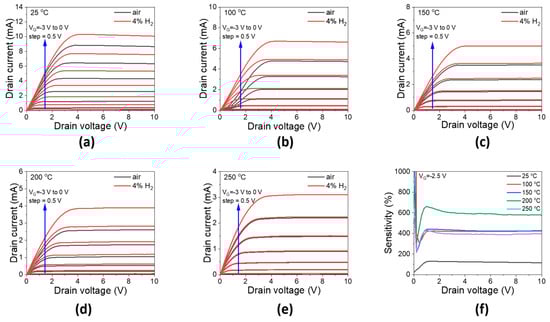 Output characteristics of the S3 sensor in air and 4% H2 gas from (a) 25, (b) 100, (c) 150, (d) 200, and (e) 250 °C at different gate voltages from −3 V to 0 V. (f) the sensitivity extracted from output characteristics at gate voltage of −2.5 V.