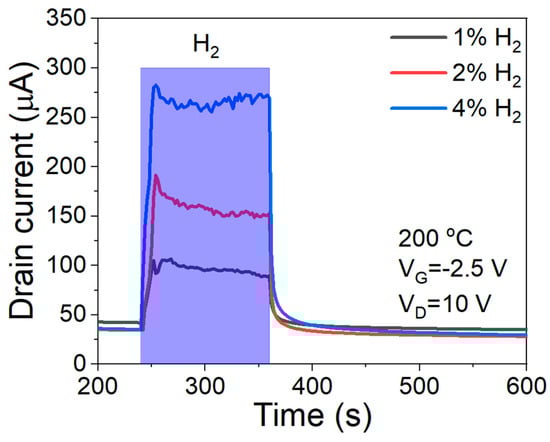 The thin WO3 layer, which acted as a filter or a blocking layer, might degrade the sensor’s performance. However, the WO3/Pd-AlGaN/GaN HEMT sensor maintained a high performance for hydrogen sensing, as shown in Figure 7. At 200 °C, the transient characteristics of the sensor showed a fast response (12 s) and recovery times (4 s) while maintaining the high sensitivity of 658% under hydrogen gas of 4% concentration.