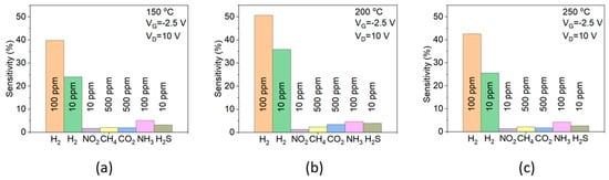 Hydrogen selectivity of S3 sensor at 150 °C (a), 200 °C (b), and 250 °C (c).