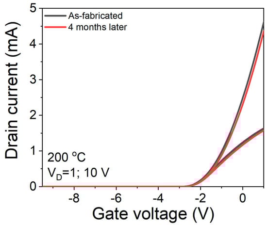The stability of S3 sensor was exhibited by the transfer characteristics at 200 °C, as shown in Figure 9. After 4 months with various measurements, we observed roughly 7% of the current collapse.