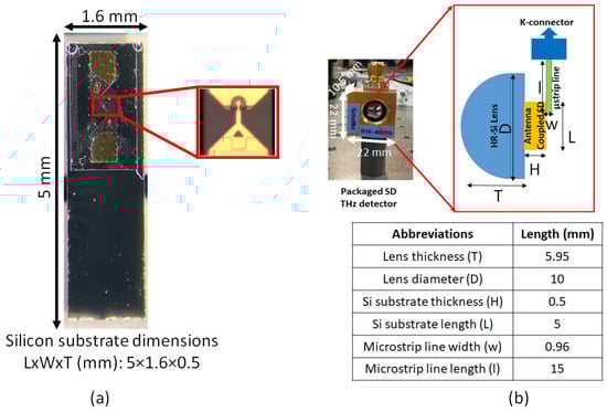 The antenna-coupled SD is shown in Figure 1a. The diode is mounted on a hyper-hemispherical highly resistive silicon lens with a thickness and diameter of 5.95 mm and 10 mm, respectively. The lens focuses the THz wave at the center of the antenna, where the SD device is mounted, as shown in Figure 1b. The brass housing is used to isolate the device from the unwanted coupling of stray fields and external noise, and protects the device from electrostatic discharge (ESD), which can easily destroy it. The device is electrically connected to the post detection electronics by a broadband microstrip line up to 40 GHz, followed by a K connector at the detector output. The housing of the detector was developed in-house with a special focus on its compactness. This compact, broadband and robust detector operates at room temperature and can easily be used by just plugging it in and playing it to the table-top THz systems as well as at accelerator facilities. Its compact size makes it suitable to be used in a very flexible manner.