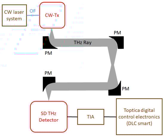 The detector was first characterized with a table-top CW system from Toptica (TeraScan 1550). Figure 2 depicts the experimental setup. It is characterized from 0.2 to 1.2 THz using a continuous wave pin-diode-based transmitter as a source. Due to aging, the setup delivers a reduced power of 1.2 and 0.065 W at 0.5 and 1 THz compared to the specs of the new system (10 W and 1 W at 0.5 and 1 THz, respectively). The SD THz detector feeds the rectified signal into a trans-impedance amplifier (PDA-S, TEM Messtechnik) with a gain of V/A followed by a lock-in amplifier (Toptica digital control electronics DLC smart) as a post-detection electronic.
