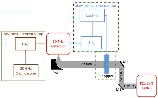 In order to discriminate temperature-dependent (bolometric) effects from fast rectification processes, two setups were implemented: Using a chopper at a modulation frequency of 113 Hz, the lock in-amplifier-based detection chain (dashed green box in Figure 3) detects all rectifying effects, including those depending on temperature changes caused by the powerful FEL beam. Fast rectification processes on the 20–50 ps scale are recorded with a 20 GHz oscilloscope (Tektronix DPO72004B real-time digital phosphor oscilloscope) (solid green box in Figure 3). As lattice-temperature dependent effects usually require at least nanoseconds (local lattice thermalization that affects the band structure and hence the IV characteristics of the SD) to milliseconds (steady state of heat flow from the hot device to the substrate) to reach equilibrium, slow thermal effects cannot be detected. To increase the detector signal on the oscilloscope, a commercially available low noise amplifier (LNA) from 0.01 to 43.5 GHz with a gain of [37 dB] (mini-circuits ZVA-443HGX+) was used. While the detector is designed to have sufficient electronic bandwidth to detect signal modulations up to 40 GHz, the oscilloscope used for these measurements limited the highest detectable modulation frequency to no more than 20 GHz. Furthermore, the overall noise floor was dominated by the input noise of the oscilloscope. The lock-in measurements at the FEL were performed at 3.082, 4.065, 4.840 and 5.560 THz. Due to technical problems, the fast response measurements with the oscilloscope were performed at 1.99, 3.082 and 4.84 THz only. The average power of the FELBE FEL depends on the wavelength, but can reach several tens of watts at most wavelengths, which is several orders of magnitude higher than the average power of typical table-top THz sources. A set of step attenuators in the beam line are used to regulate the power delivered to the measurement site, as the power of a few watts can easily destroy the SD THz detectors. For calibration purposes, the power was measured with a 3A-P-THz sensor from Ophir Optronics.