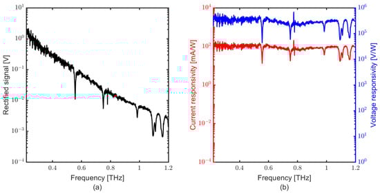 (a) Rectified voltage of the SD THz detector with the table-top source, (b) current responsivity of the SD on left y-axis (red colour) and voltage responsivity on right y-axis with respect to frequency (blue colour), here including the trans-impedance gain of V/A.