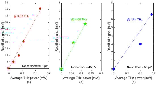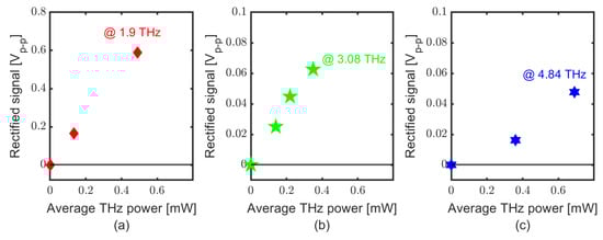 Fast rectification processes are recorded with the experimental setup shown in Figure 3, with the post detection electronics (solid green box). Figure 7 shows the peak–peak voltage recorded for several powers at 1.9, 3.08 and 4.84 THz. Similar to the lock-in measurements, no saturation was observed within the measurement accuracy. In order to evaluate the responsivity, the peak power, , was determined from the average power, recorded with the pyroelectric detector as , where is the (frequency-dependent) pulse duration and MHz is the repetition rate of FELBE. Figure 8 shows the peak–peak rectified signal and voltage responsivity of the detector. The maximum obtained voltage responsivity is 0.12 / at 1.99 THz, 0.02 / at 3.08 THz and 0.0035 / at 4.84 THz. The voltage responsivity with the oscilloscope measurement technique shows only a roll-off, i.e., much less severe than for the lock-in measurements, pointing again to low-pass filter losses of the lock-in intermediate frequency (IF) chain. The responsivity of the detector decreases with the wider spectra (high frequencies) due to the attenuation from the limited IF bandwidth and post detection electronics (20 GHz oscilloscope used for these measurements).