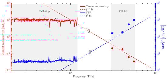 Figure 6, shows the combined current responsivity (in red colour) trend with both table-top source as well as the FEL. The TIA gain of V/A with the lock-in amplifier (signal recovery 7270 from AMETEK) measurements was used for both table-top and FEL experiments. At 3.08 THz, a maximum responsivity of 97.02 V/W was observed with a TIA gain of V/A, and at 4.065, 4.84 THz and 5.56 THz a responsivity of 45.48, 11.54 V/W and 2 V/W was observed, respectively. We remark that the lock-in amplifier only detects the average signal generated by the SD, while the actual received signal is composed of many, ps-scale short pulses with a THz frequency-dependent pulse length. While a thermal power meter in this case will rather measure the pulse energy deposited within the integration time of the lock-in with little loss, the post detection electronics may partially low pass filter some of the rectified signal, resulting in a reduced signal amplitude. As we do not have any continuous-wave signals available at the FEL wavelengths, we cannot make any conclusive statements at this point and need to leave this aspect for future studies. Further, the interplay of a decreasing antenna radiation resistance of the antenna and the electrodes of the Schottky with increasing frequency and the RC-roll-off leads to an empirical roll-off of the responsivity which is indicated by the fit in Figure 6. The severe loss of responsivity between the CW and pulsed data may be due to filtering by the post detection electronics, but this phenomenon needs to be enlightened in future work. Figure 6 also shows the NEP in the blue colour on the right y-axis. From 0.2 to 0.6 THz, NEP of 10 pW/ is obtained. At 1.2 THz, NEP is 17 pW/. At higher frequencies (FELBE measurements), NEP increases to 0.9 W/ at 5.56 THz with the trend of .