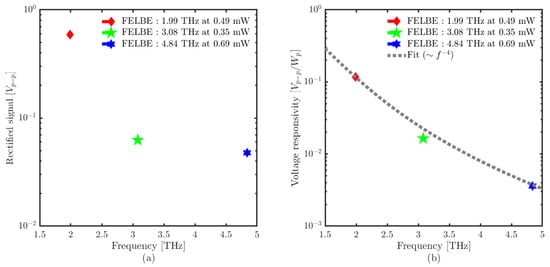 (a) Peak–peak rectified voltage; (b) voltage responsivity of SD THz detector with FEL using the oscilloscope measurement technique.