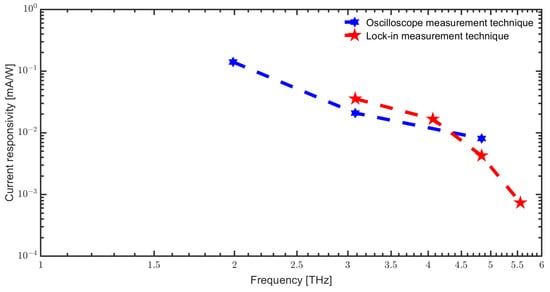 In [,], we have derived the frequency-dependent conversion factor originating from the various imperfections of the setup and compared the estimated average rectified current from the oscilloscope measurements with those from the lock-in. The derived conversion factor is used to compare the two measurement techniques results. Figure 9 shows the comparison between the current responsivity with the oscilloscope and lock-in measurement technique, which shows a very good agreement. We therefore conclude that slow, bolometric thermal detection does not play a noticeable role for the SD detector at least between 3 and 5 THz, where data for both detection mechanisms are available.