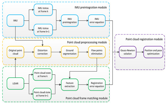 - Point cloud registration module: the IMU error equation and the point cloud registration error equation are combined and solved by the Gauss–Newton method to minimize the error function and output the optimized position and pose.