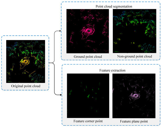 - Point cloud preprocessing module: the IMU linear interpolation method is used to correct the distortion of the point cloud to improve the quality of the original point cloud. Second, the ground segmentation method of RANSAC is used to segment the original point cloud into ground points and nonground points to provide additional ground constraints for z-axis displacement. Finally, the unstable flaw points are eliminated to improve the stability of point cloud registration.