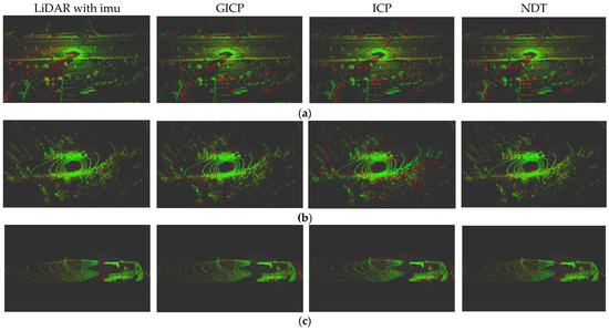 - Magnusson, M.; Nuchter, A.; Lorken, C.; Lilienthal, A.J.; Hertzberg, J. Evaluation of 3D Registration Reliability and Speed—A Comparison of ICP and NDT. In Proceedings of the 2009 IEEE International Conference on Robotics and Automation, Kobe, Japan, 12–17 May 2009; IEEE: Piscataway, NJ, USA, 2009; pp. 3907–3912. [Google Scholar]