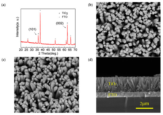 Figure 1a shows the XRD pattern of the TiO2 nanowire arrays. It is clear that there were only two sharp diffraction peaks, such as (101) and (002), observed at 36.20° and 62.84°, respectively, which can be assigned to the tetragonal rutile phase (JCPDS No. 88-1175) [17]. Moreover, the (002) diffraction peak was clearly enhanced compared with the (101) diffraction peak, while some diffraction peaks such as the (111), (211), and (110) crystal planes were absent, which suggests that the highly oriented TiO2 nanowire grew preferentially along the [001] orientation with the growth axis perpendicular to the FTO substrate. Figure 1b,c indicate the top-view and tilt-view FESEM images of the TiO2 nanowire arrays, respectively. It is observed that the FTO substrate was densely and uniformly covered by the vertically aligned TiO2 nanowire arrays with smooth edges and rough top surfaces. Figure 1d displays the cross-sectional FESEM image of the TiO2 nanowire arrays. It is clearly shown that the average height and diameter of the rutile TiO2 nanowire arrays were about 1.5 μm and 180 nm, respectively.