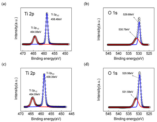 Figure 2 shows the XPS spectra of the Ti 2p and O 1 s in the rutile TiO2 nanowire arrays before and after the rapid nitrogen annealing treatment. As shown in Figure 2a, the Ti 2p3/2 and Ti 2p1/2 peaks around 458.48 eV and 464.08 eV can be observed. The spin-orbit splitting binding energy between Ti 2p3/2 and Ti 2p1/2 was approximately 5.6 eV, indicating the existence of Ti-O bonds in the rutile TiO2 nanowire arrays. Figure 2b reveals the XPS spectrum of O 1 s. It was found that the peak at the binding energy of 529.68 should be attributed to the lattice oxygen in the rutile TiO2 nanowire arrays, while the peak at the binding energy of 530.78 eV may be assigned to the oxygen vacancies, which suggests that the as-prepared rutile TiO2 nanowire arrays contained a considerable amount of oxygen vacancies, after the rapid nitrogen annealing treatment at 450 °C for 1 h, as shown in Figure 2c,d. It is obvious that the Ti 2p3/2 and Ti 2p1/2 peaks were found at 458.39 eV and 464.09 eV, respectively. In addition, the peak area of the 531.58 eV binding energy corresponding to the oxygen vacancies in Figure 2c was about 12.4% larger than that of the 530.78 eV binding energy in Figure 2a, which means that the nitrogen atoms entered the rutile TiO2 nanowire arrays and replaced the lattice oxygen atoms [32], resulting in an increase in the oxygen vacancies in the rutile TiO2 nanowire arrays.