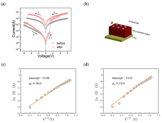 After the rapid nitrogen annealing treatment, N atoms entered the surface of the TiO2 nanowire arrays and replaced the O atoms, which resulted in the increase in oxygen vacancies at the W/TiO2 Schottky barrier. It is worth noting that the increase in the oxygen vacancies at the W/TiO2 Schottky interface led to reducing the depletion layer thickness and lowering the barrier height of the W/TiO2 Schottky barrier. Thus, a lower Schottky barrier height of 0.37 eV and smaller set voltage of 1.09 V (Vset), as well as a higher resistance ratio of about three orders of magnitude, were observed after the rapid nitrogen annealing treatment, as shown in Figure 3.