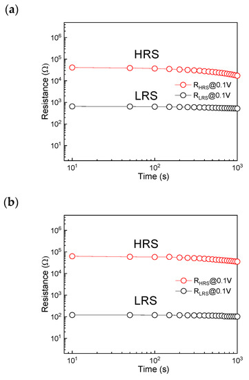 Figure 4. Retention tests of the device at the reading voltage of 0.1 V (a) before and (b) after the rapid nitrogen annealing treatment.