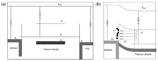 Figure 5. Schematic diagram of the relative band positions of the W, TiO2, and FTO (a) before and (b) after the formation of the W/TiO2 Schottky interface.