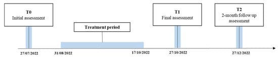 The evaluation of the patient was carried out before the start of the treatment (T0—27 July 2022), at the end of the treatment to verify improvements compared to the initial condition (T1—27 October 2022), and two months after the end of the treatment (T2—27 December 2022) to verify the maintenance of the results achieved at T1.