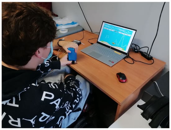As an additional parameter to evaluate grip strength, a virtual reality (VR) game-based evaluation system was used to measure the patient’s improvements in force control and modulation [19,20]. This system involves the use of three piezoresistive sensors (FSR® by Interlink Electronics, Camarillo, CA, USA), applied at the level of the distal phalanges of the I, II, and III finger, to measure the grip force exerted by each finger. The sensors are fixed on the fingertips by means of Velcro straps. In addition, a PLA plate printed in three dimensions (1 × 10−3 mm of thickness, 2 × 10−2 mm of diameter) was positioned between the sensor and the Velcro strap to uniformly distribute the force and fix the sensor to the finger. Sensors were calibrated using the Instron® testing machine to relate force and output voltage, acquired through a custom-made printed circuit board.