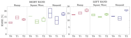 Figure 5 shows the boxplots of the RMSE in each session for both hands. Errors decreased for the “Square Wave” and “Sinusoid” between sessions T0 and T1. However, RMSEs tended to increase again between T1 and T2. Nevertheless, these differences were not statistically significant for the right hand during the three exercises in the three evaluation sessions T0, T1, and T2 (p = 0.63). For the left hand, instead, the Kruskal-Wallis test and multiple comparison analysis with Bonferroni correction [23] revealed that errors executed at session T2 were statistically higher than the errors at session T1 (p = 0.0079). Overall, median RMSEs calculated on the entire evaluation session (i.e., the three waveforms together) were 14.1%, 12.9%, and 13.6% for T0, T1, and T2 for the right hand, as well as 13.7%, 12.8%, and 16.7% for T0, T1, and T2 for the left hand.