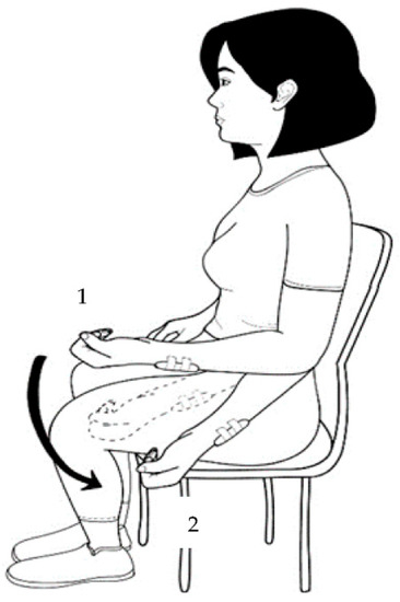 Location of the inertial sensor. The sensor was attached to the lateral side of the forearm: (1) starting position and (2) ending position.
