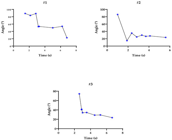 Representation of the pendulum tests using the inertial sensor: Flexion and extension peaks represented by the blue dots, according to the trajectory of angles (°) and time (s) for participants #1, #2, and #3.
