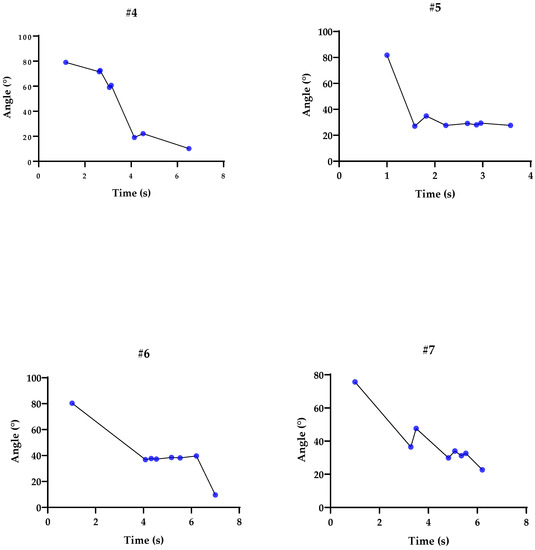 Representation of the pendulum tests using the inertial sensor: Flexion and extension peaks represented by the blue dots, according to the trajectory of angles (°) and time (s) for participants #4, #5, #6, and #7.