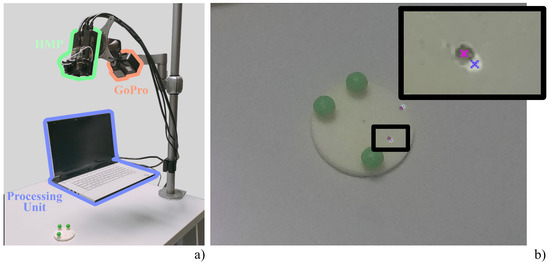 Spatial registration. (a) Set-up for evaluation of spatial registration consisting of the HMP (green) and the GoPro Hero 5 (orange), both placed on a holder for working depth selection, the processing unit (blue), and the spatial registration evaluation tool. (b) Zoom of an image captured by the GoPro Hero 5: pink crosses denote the real reference points, whereas blue crosses denote the projected points.