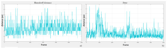 Figure 2b, shows the extracted real and virtual centrelines of the real and projected cutting lines, and it highlights the points identifying the Hausdorff distance. This process was repeated for each frame to estimate the total registration error. In addition, the stability of the projected line was evaluated in terms of jitter, which is the deviation from the mean of all the projected lines, and it is used to obtain an estimate of the stability of the virtual content. The latter information was derived by fitting the lines with a 7-order polynomial. The average line was then found by averaging the coefficients among all the captured frames.