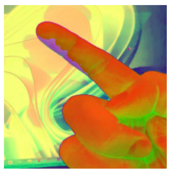 In image pre-processing, RGB must first be converted to the HSV color space that is less affected by light [19] to facilitate the identification of skin color features of fingers and avoid most color noise. To effectively solve the RGB light source and color interference phenomenon obtained by camera photography, it is necessary to convert it into a more accurate and stable HSV color space, as shown in Equations (1)–(3) [19]. This will generate pseudo-colors, as shown in Figure 3.