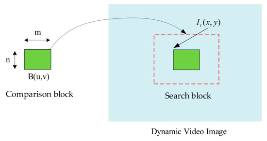 To achieve the capability of discriminating dynamic gestures or action images [26] for interactive virtual interaction [27], the contrast blocks created are pre-contrasted for each captured dynamic image and thus unrelated to the previous implementation. represents the image in the comparison window that will be captured in the picture. The search block portion is calculated based on the size of the comparison block. When fingers are bent, and their heights are unsuitable or coordinated with adjacent or stretched fingers, accuracy will be affected [27,28]. Therefore, a window is used to frame the continuous and relatively large skin color to represent the fingertip for simulating mouse pointing functionality [29]. In Equation (13), it indicates that the mean square error (MSE) compares the differences between two dynamic images. Among them, it represents the number of pixels of the window size to be compared, and x and y are coordinate positions relative to the window size, representing dynamic images of time t and time t-1, respectively. As shown in Figure 5, these two images are obtained by comparison, allowing you to know the motion of a moving object. At this time, when the MSE value is the smallest, the center point position measured by the two images is the distance that the relative object moves in the image. If this value is small, the image is more similar [29]. If the value is too large, it is not the search target. The comparison block moves point by point until the target is found.