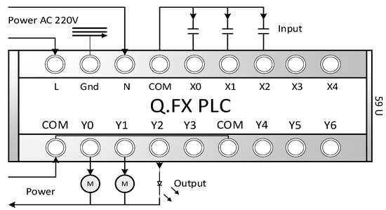 The PLC corresponds to the X~X4 contacts, where X is the input contact, Y is the output contact, M is the external motor, and COM is the common parallel point. The L and N of the power supply represent the live and neutral wires, respectively. The Q and FX models are PLCs introduced by the MITSUBISHI Company. This PLC, designed for this system, allows the control logic program to be updated through the users such as the DT mapping model in DT-HMIS of this system, without being limited by the developer. Users/patients can also extend peripheral device control on their own.