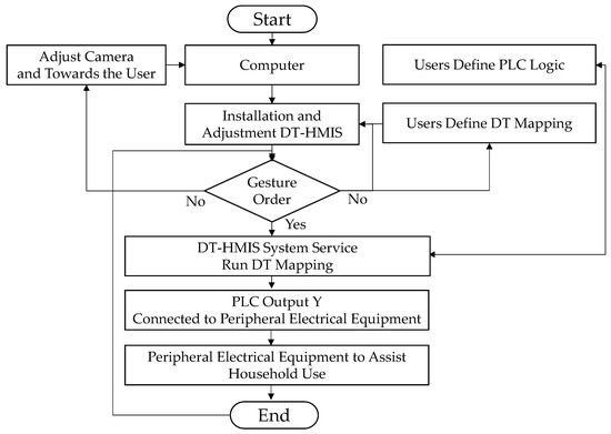 A self-holding logic circuit was designed for the lamps to maintain a stable brightness and avoid the flicker effect. When the user’s gesture forms the number 47, it maps to the X2 input point. When the X2 contact is triggered, the delay of 0.5 s is temporarily stored and held as 1, entering a self-holding trigger state. When the gesture is slid again to form the number 47, it is activated again and mapped to the X2 input point, and the delay of 0.5 s evolves to 0, and the continuous trigger state also ends. At this time, the PLC’s Y2 output is designed as an odd function output; that is, it is only either 1 or 0. In summary, when the user slides their gesture to the number 47, the light signal will remain on, and when the user slides their gesture again to form the number 47, the light signal will change state and turn off after a delay of 0.5 s. Figure 10 reveals the flow chart of the proposed system operation. Table 3 indicates the equipment and development environment.