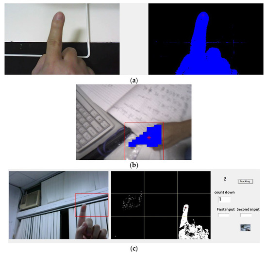 The proposed system is a real-time operation, and many interference signals can affect the recognition results. In this system, a register is used to store the recognition results. When a finger gesture remains still for more than a predetermined number of seconds, it is considered a recognition result and recorded for coding. A temporary code is set as C0, a stay duration code is set as Ct, and the initial values of C0 and Ct are both 0. Here, C1 and C2 are the numeric codes of the output function, and their initial values are also set as 0. The constant limits of Equation (17) have been determined by actual testing and adjustment according to background complexity. After obtaining the recognition results, Equation (18) is used for judgment to obtain the numeric codes.