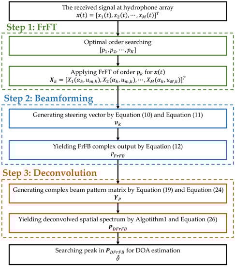Linear frequency modulation (LFM) signals are widely used in hydroacoustic communication and detection, and direction of arrival (DOA) estimation is important [,]. To estimate received signal DOA, beamforming methods represented by conventional beamforming (CBF) [] and minimum variance distortionless response (MVDR) [] were proposed. However, those methods cannot directly estimate the wideband signal DOA due to the steering vector being frequency-dependent [].