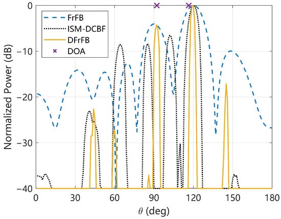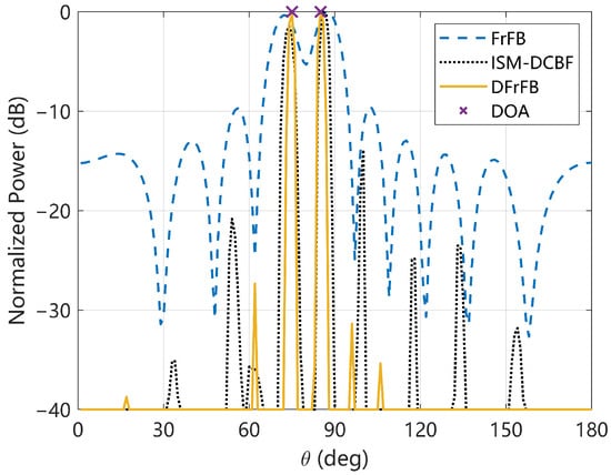 In this section, the performance of DFrFB is verified by five simulations. The same simulations are performed for FrFB and ISM-DCBF for reference. The root mean square error (RMSE) of the DOA estimation and resolution probability (RP) are calculated to evaluate the spatial resolution. The beamwidth and maximum sidelobe level are recorded to evaluate the optimization of the space spectrum. When the estimated DOAs and the real DOAs satisfy Equation (27), two targets are considered to be successfully discriminated. Assuming times Monte Carlo experiments are performed and times experiments satisfy Equation (27), the RP is defined as . The RMSE is calculated only when the RP is 1. The beamwidth is also referred to as the half-power beamwidth, i.e., the width of the mainlobe at .