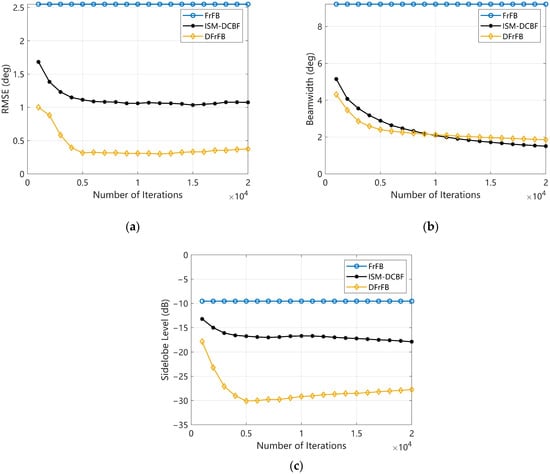 The performances of FrFB, ISM-DCBF, and DFrFB versus the number of iterations. (a) The RMSE; (b) the beamwidth; (c) the sidelobe level.