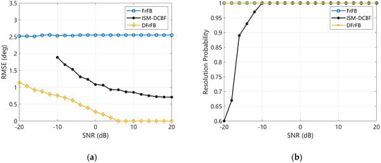 This section investigates the effect of noise on the spatial resolution with the SNR ranging from −20 dB to 20 dB. The real DOAs of the two targets remain 75° and 85°. As shown in Figure 4a, the FrFB is insensitive to noise, and its RMSE fluctuates slightly with the SNR. However, the estimation error is large regardless of the SNR. The RMSEs of DFrFB and ISM-DCBF decrease with increasing SNR. The DFrFB accuracy is better than that of ISM-DCBF, showing better noise resistance. In Figure 4b, benefiting from the FrFT energy-focusing property, the RP of FrFB and DFrFB remains 1 even if the SNR is as low as −20 dB. In contrast, ISM-DCBF reaches an RP of 1 only when the SNR is higher than −12 dB. The DFrFB based on FrFD signal processing demonstrated better spatial resolution at low SNRs compared with ISM-DCBF based on frequency-domain signal processing.