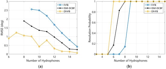 In this section, the effect of the number of hydrophones on the spatial resolution of the DFrFB is studied. The SNR is 0 dB, and the real DOAs of the two targets are the same as in Section 4.3. The RMSE and RP for the number of hydrophones varying from 3 to 15 are shown in Figure 5. DFrFB obtains the smallest DOA estimation error in Figure 5a. As shown in Figure 5b, to reach an RP of 1, DFrFB needs at least six hydrophones, while ISM-DCBF needs eight and FrFB needs nine. DFrFB can realize more accurate DOA estimations with fewer hydrophones. It is shown that DFrFB can obtain a high spatial resolution with a small aperture array.